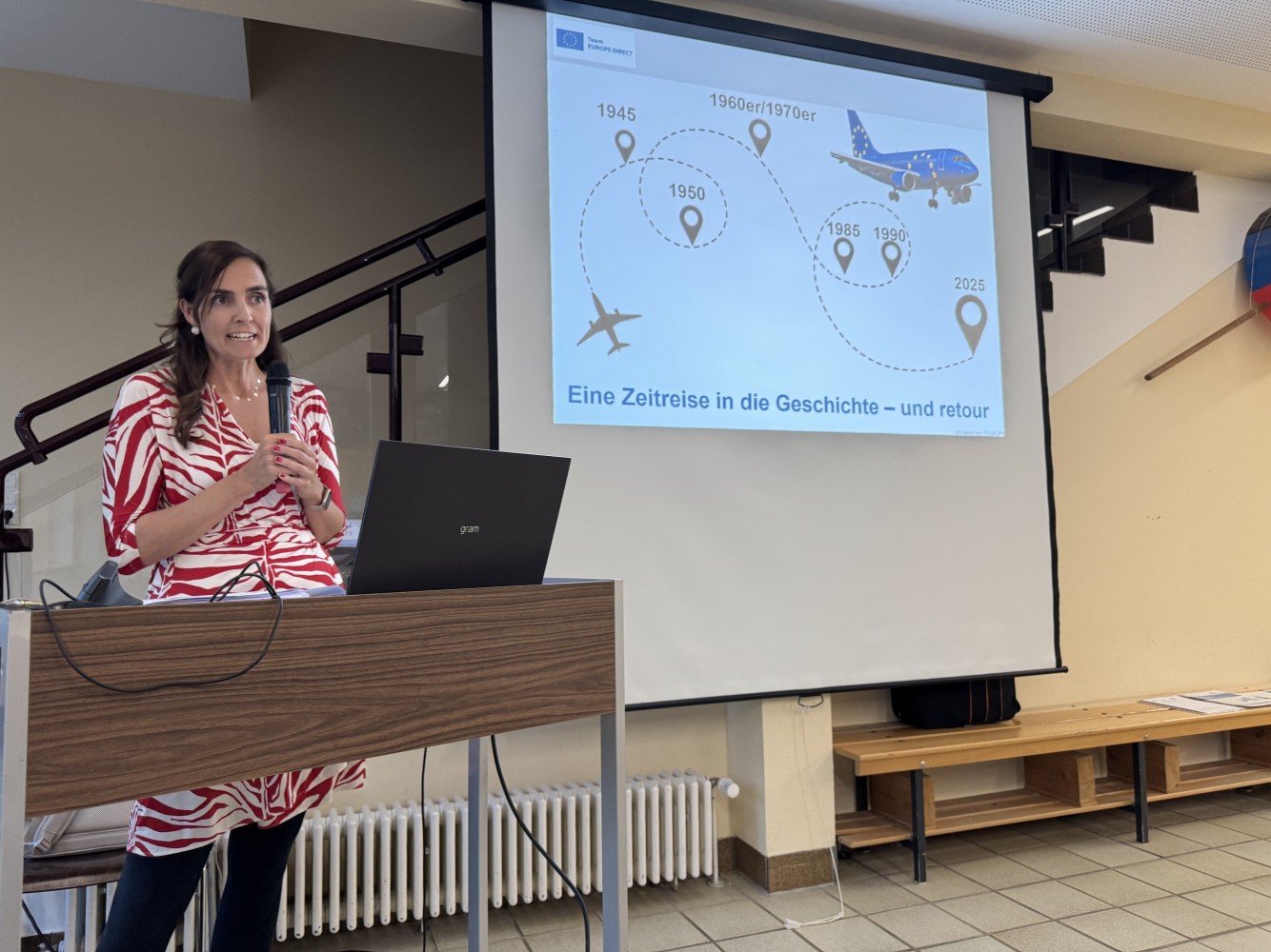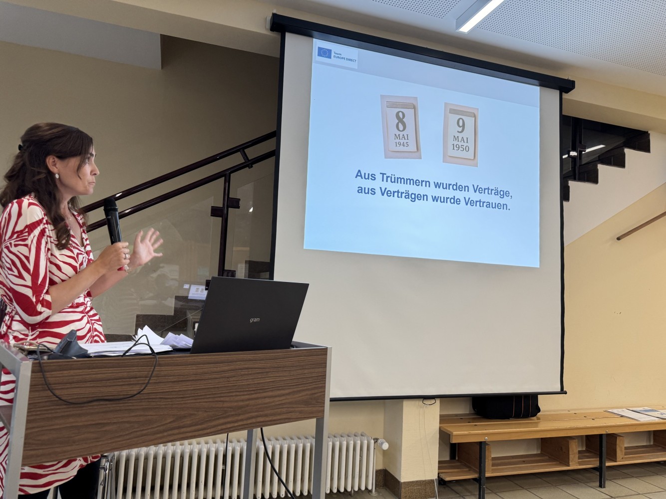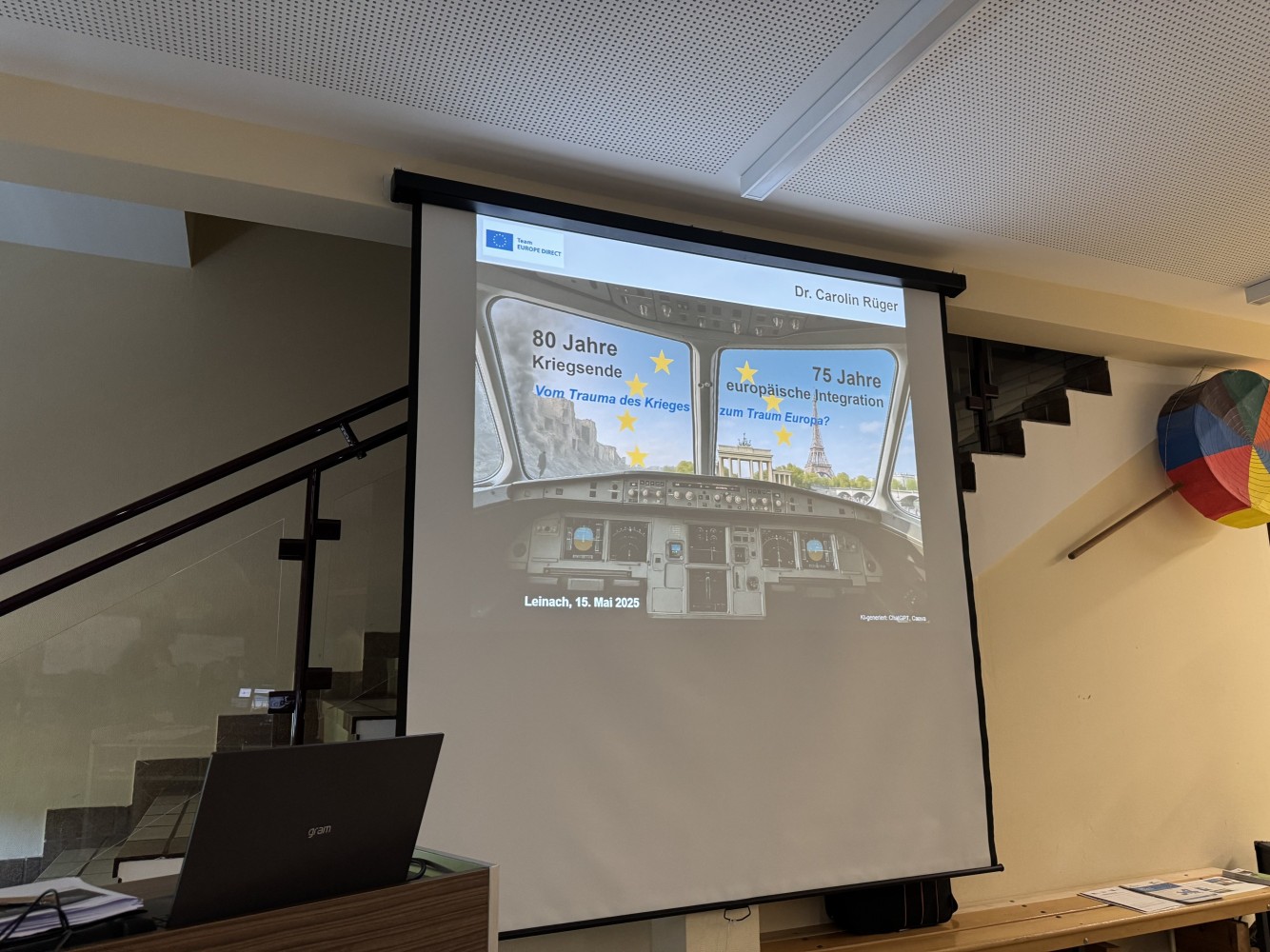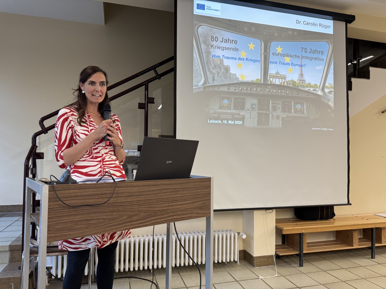 Zum Gedenken an das Kriegsende vor 80 Jahren haben wir zusammen mit dem Leinacher Komitee für Europäische Partnerschaft am 15.05.2025 einen Vortrag in der Aula der Grundschule Leinach organisiert, bei dem das Thema Kriegsende aber auch „75 Jahre europäische Integration“ thematisiert wurde.