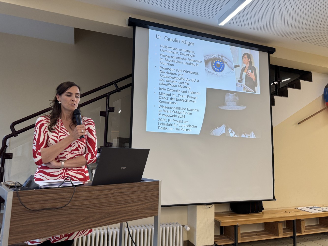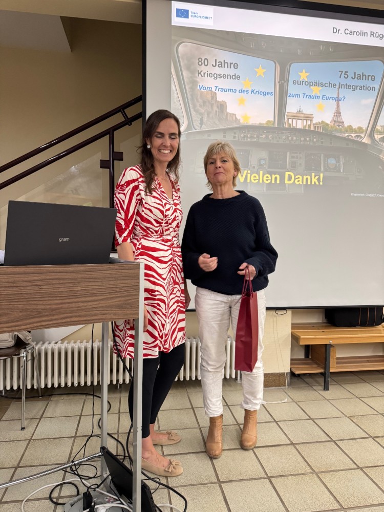 In der vollbesetzten Aula der Grundschule nahm uns Frau Dr. Rüger in ihrem kurzweiligen Vortrag mit auf einen Flug durch die Jahre nach dem Ende des zweiten Weltkrieges bis in die Gegenwart. Die wichtigsten Stationen auf dem Weg hin zu dem Europa wie wir es heute kennen wurden dabei von ihr erklärt und interpretiert.